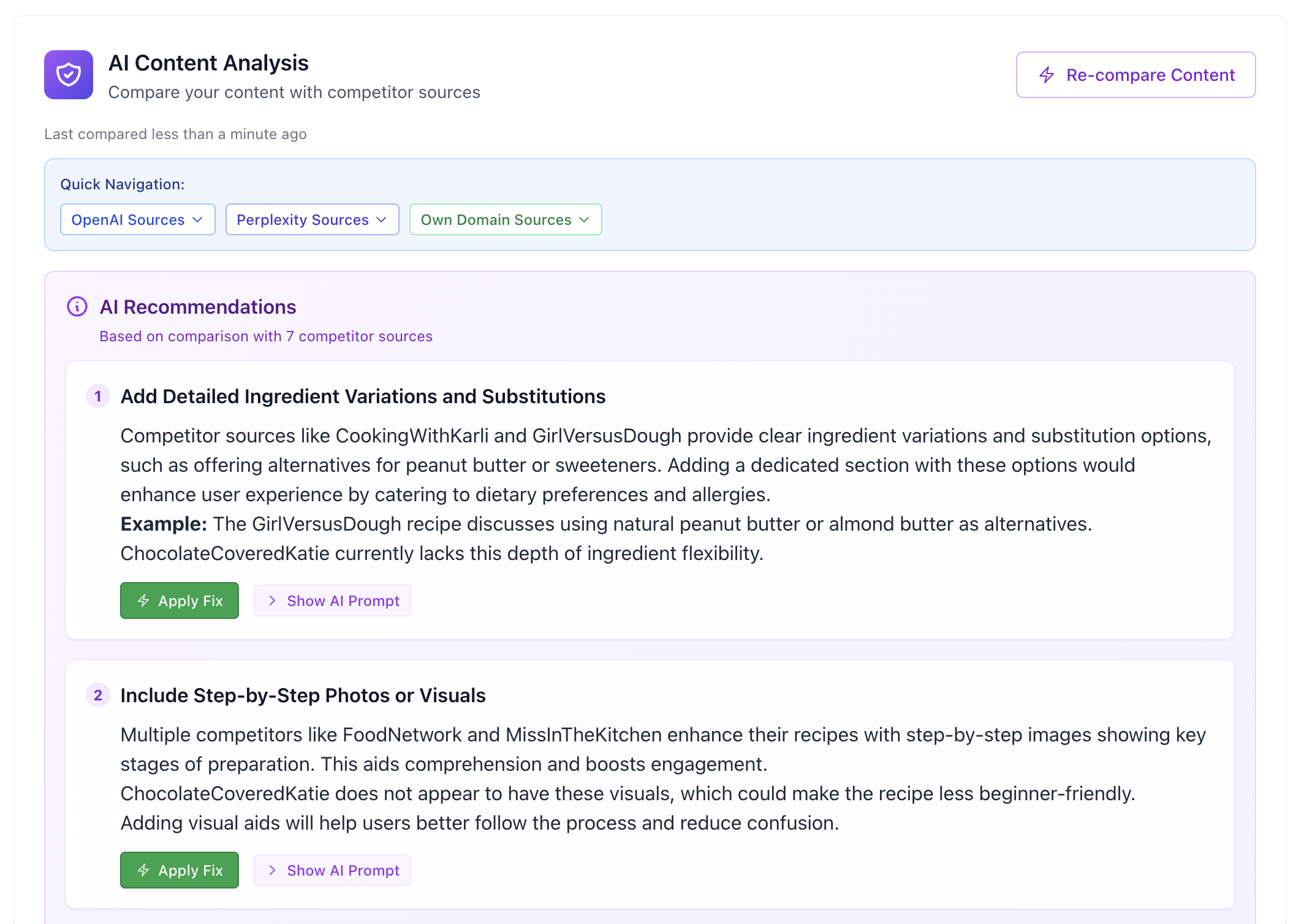 The platform runs Lighthouse diagnostics and transforms the results into step-by-step AI-generated technical instructions. It highlights performance issues, blocking scripts, layout shifts, and schema errors, always paired with practical WordPress-friendly fixes. You receive precise recommendations that can be applied instantly without technical guesswork.