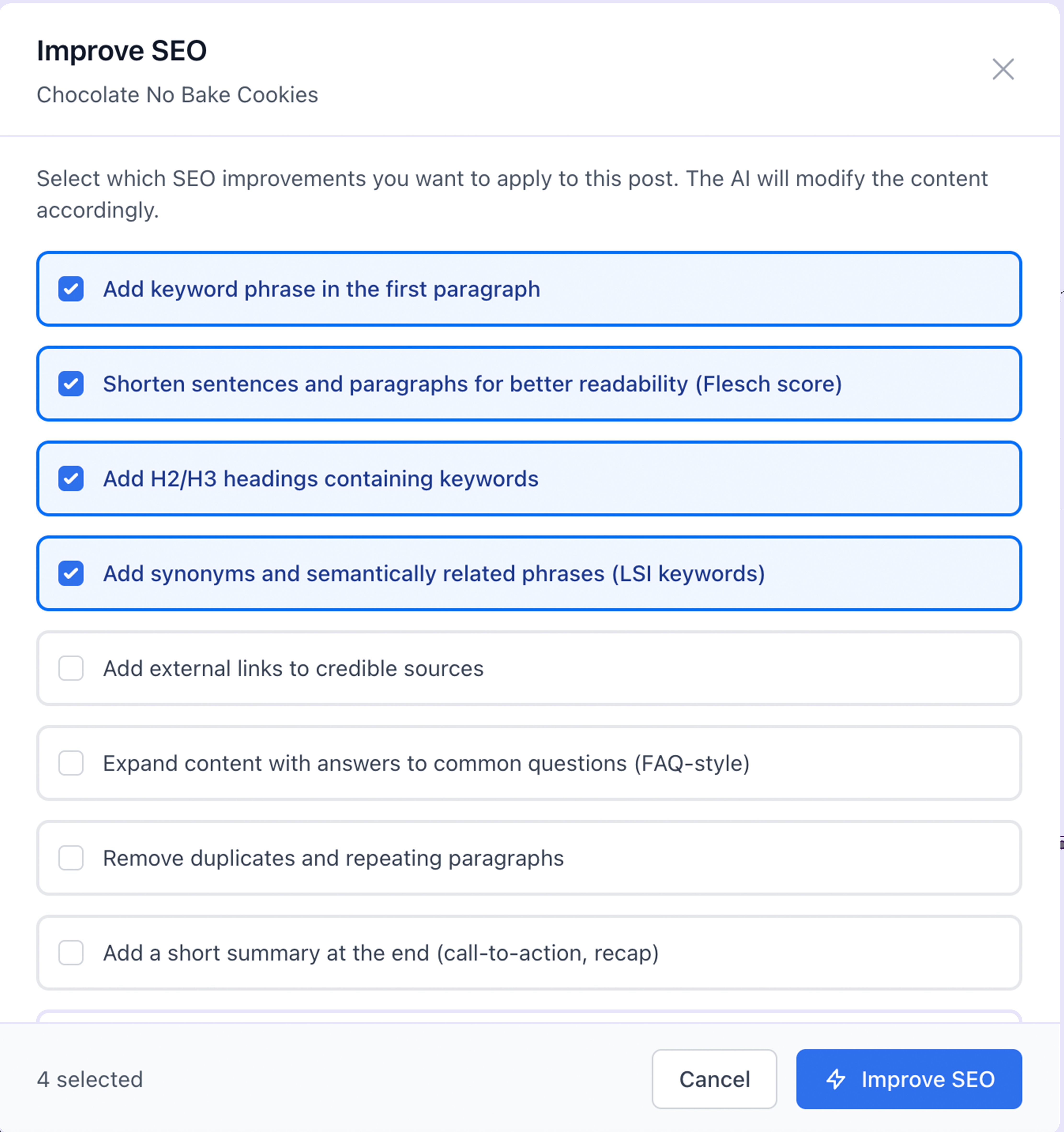 The optimizer rewrites and enriches content with AI, improving meta tags, headers, schema, CTA placement, FAQ sections, and overall semantic density. All enhancements are generated as safe, review-ready drafts pushed directly to WordPress via API. You maintain full control while accelerating your publishing workflow.
