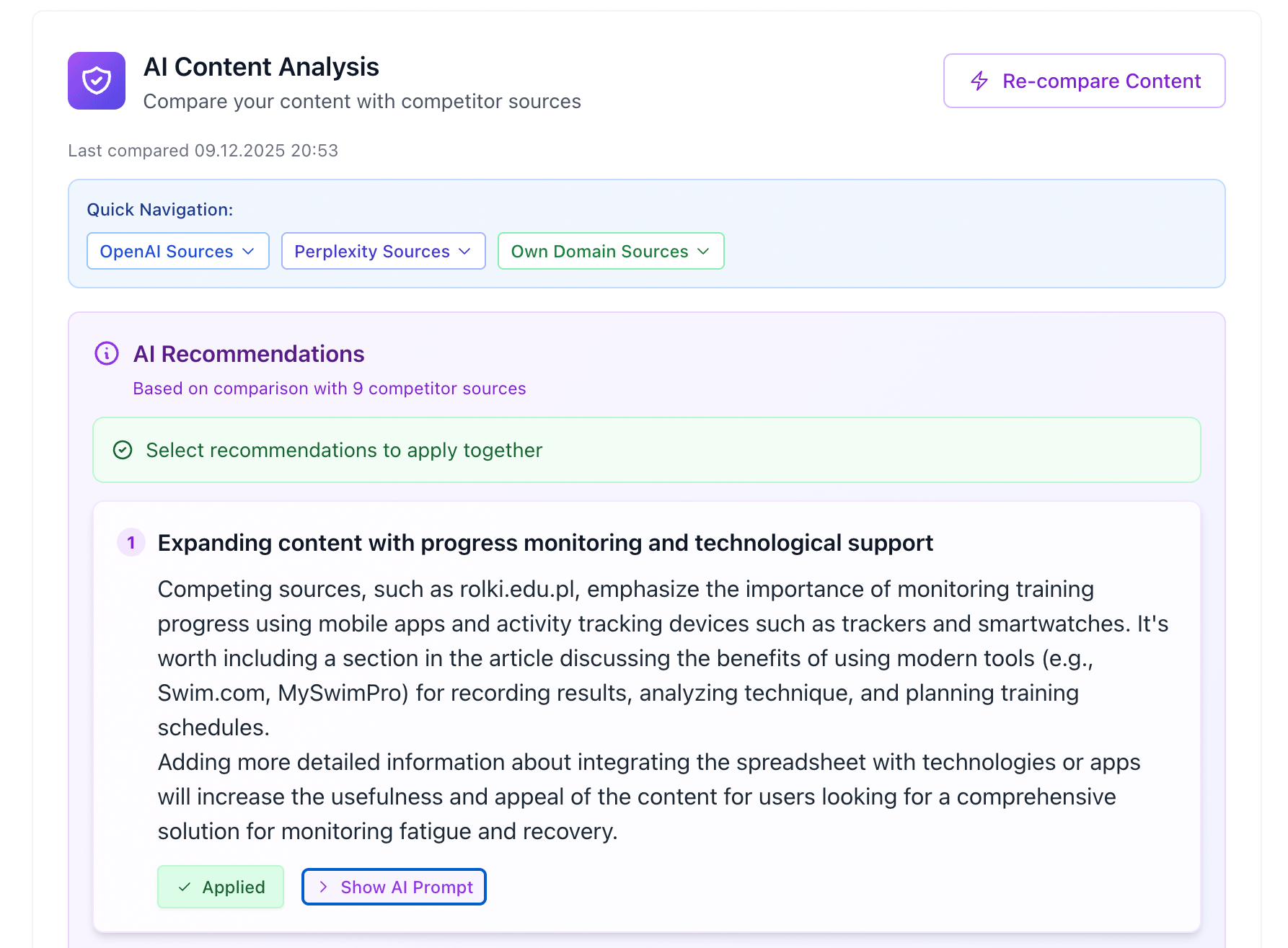 Your “competition” is the sources AI already uses. Compare coverage and get explainable recommendations.